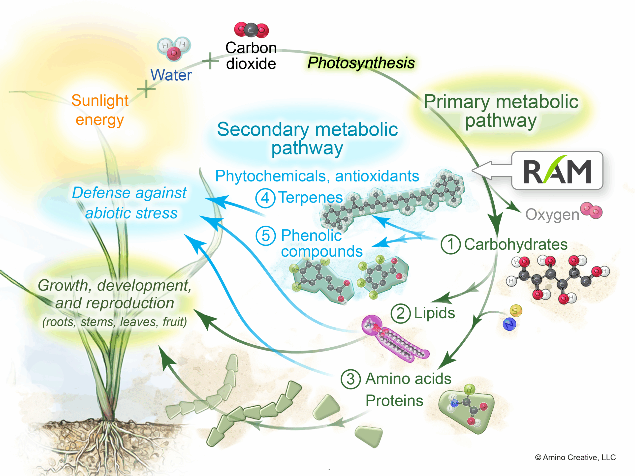 When a plant is out of charge balance:RAM technology (Redox Active Molecules) works like a charge “shock absorber” in the plant and soil. These molecules can give or take charge, helping plants maintain balance even under stress.