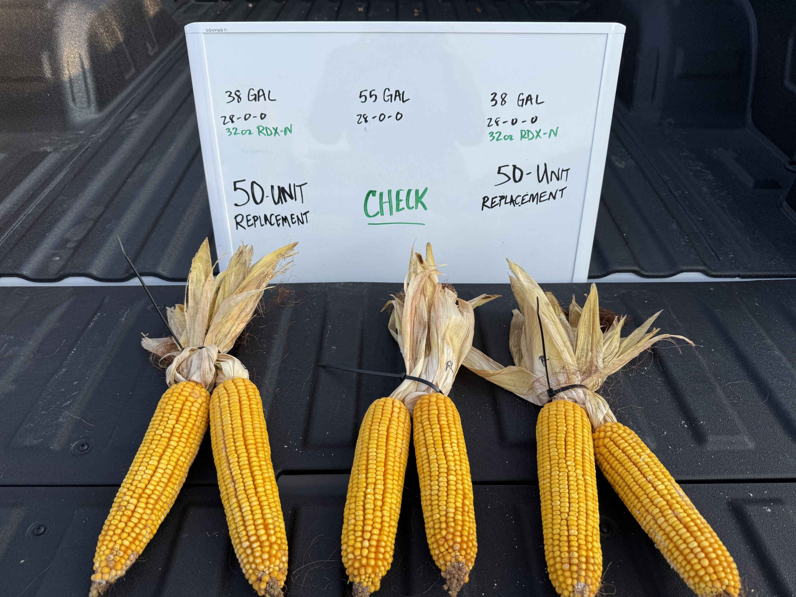 RDX-N on the left and right, grower standard practice (GSP) in the center. Observations showed RDX-N treated ears had more consistent length and less variation compared to the GSP, even with the 50 lb. replacement.