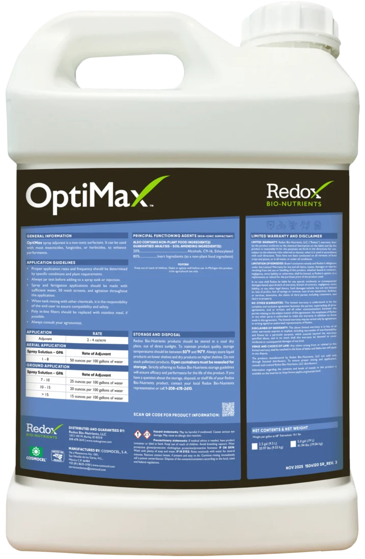 OptiMax is formulated with Redox Active Molecules to deliver superior spray performance with simplicity. With an ultra-low use rate of just 2 oz per acre, it’s easy to handle and apply—making every application more efficient and effective.